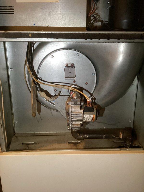Responded to a no-heat call for a system over 10 years old. Diagnostic inspection revealed a failed high limit switch and compromised heat exchanger. Observed significant sooting around the exhaust vent pipe, confirming combustion issues. Presented customer with options to either repair or replace the aging system due to safety concerns.