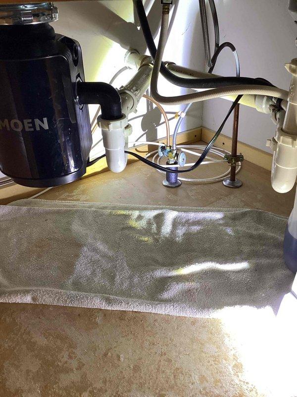 Responded to customer report of leak under kitchen sink. Conducted thorough inspection of plumbing components and ran operational test, filling both basins and monitoring drainage. No active leaks detected; customer's previous application of pipe cement to drain assembly appears to have successfully resolved the issue.