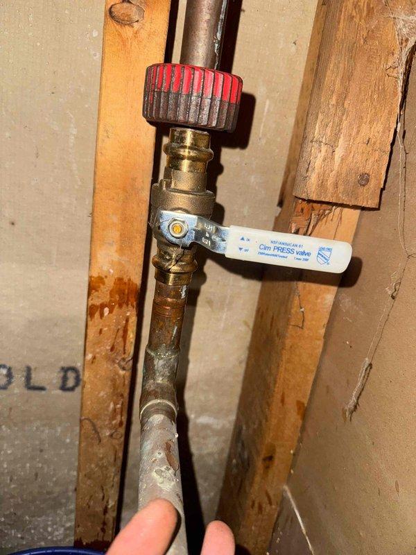 Responded to a callback for a leaking ball valve which had developed a crack in the brass body. Upon inspection, found a 3/4" ball valve with a "PRESS valve" tag that was actively leaking at the connection point. Replaced the damaged valve with a new 3/4" ball valve, resolving the leak issue.