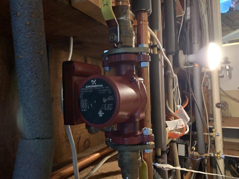 Responded to service callback for boiler displaying error message and inoperative zone. Diagnosed failed circulation pump in library zone causing insufficient heat. Replaced defective Grundfos pump on copper distribution piping, restoring proper system operation and heat to affected area.