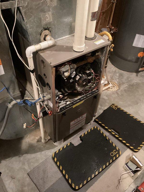 Performed scheduled maintenance tune-up on residential heating system. Inspection revealed rusty heat exchanger in furnace unit. Completed all required preventative maintenance procedures and adjustments to restore optimal operation.