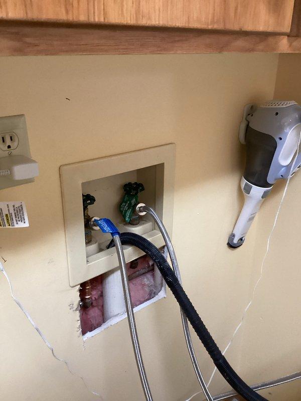 Responded to emergency service call for burst pipe behind washer. Upon inspection, identified leaking shut-off valves in utility box with damaged insulation. Replaced both shut-off valves to resolve the issue and prevent further water damage.