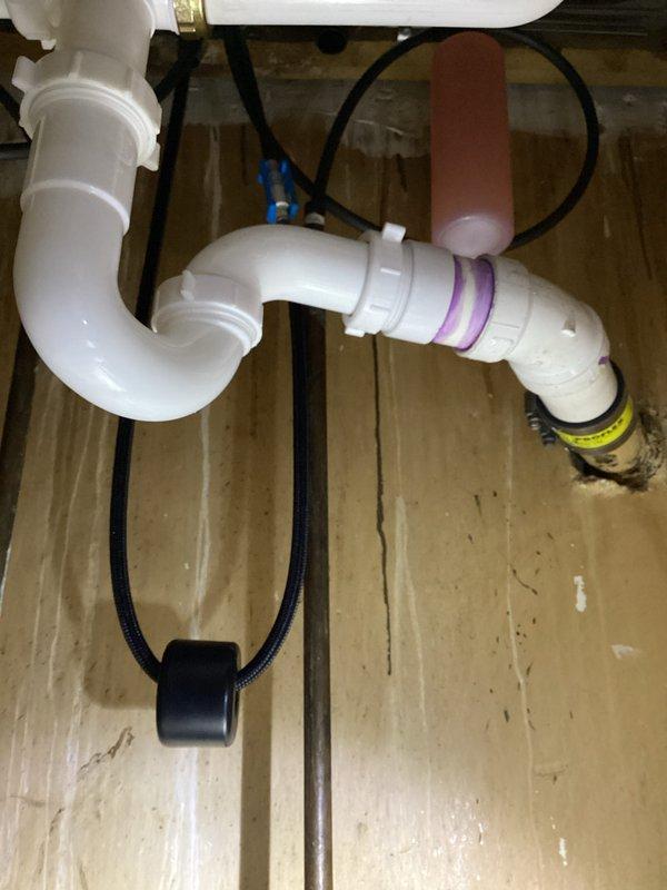 Responded to emergency leak call under kitchen sink where customer's DIY faucet installation had disturbed copper supply line. Upon inspection, found leak at cast iron to PVC drain pipe connection. Completely rebuilt the P-trap assembly with proper PVC connections and primer/cement to ensure watertight seal at all joints. Tested drain system for proper function and verified no leaks present upon completion.