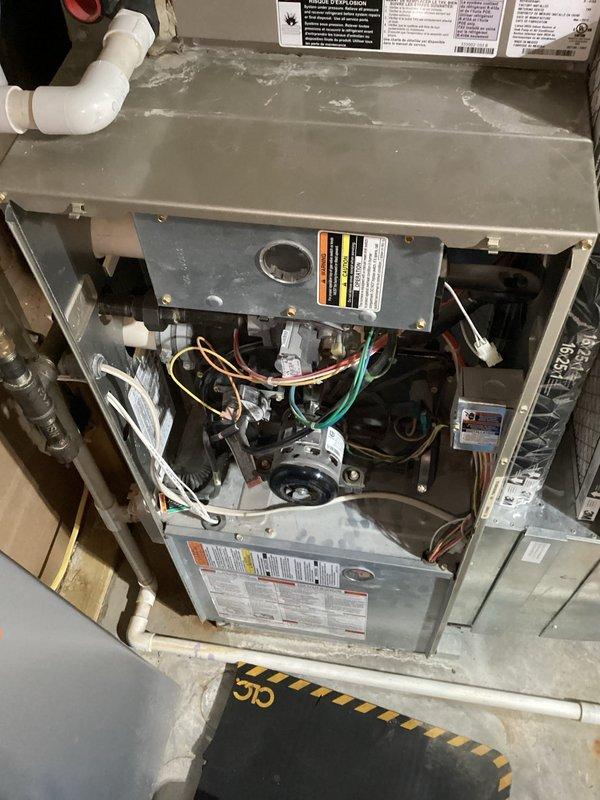 Diagnosed 15-year-old furnace system not producing heat. Inspection revealed restrictive filter and aging blower motor causing operational noise. Home warranty claim was denied. Performed visual inspection of internal components including control board, wiring harness, and drainage system.