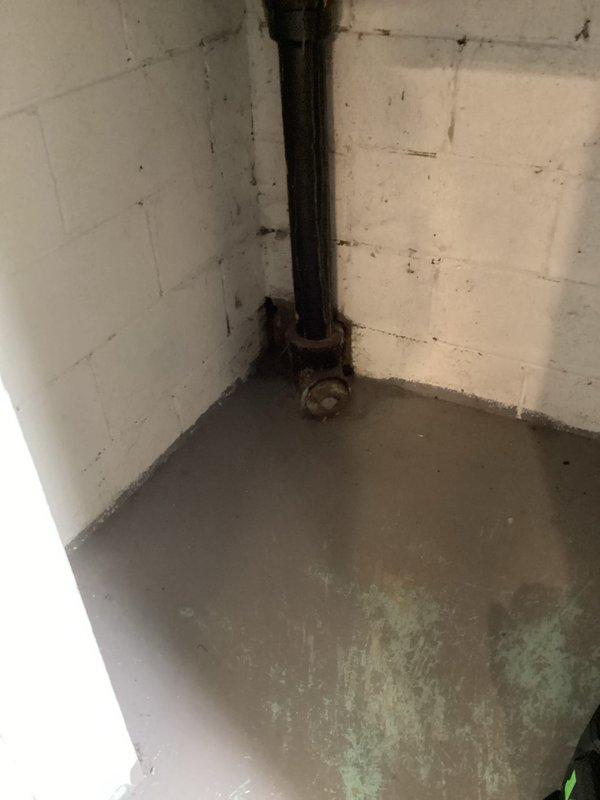 Conducted a plumbing inspection of a basement drainage system, identifying significant corrosion and moisture issues at the base of the main stack. Documented evidence of water damage on the concrete floor surrounding the drain pipe connection, with visible rust deterioration that may require remediation to prevent future leaks.