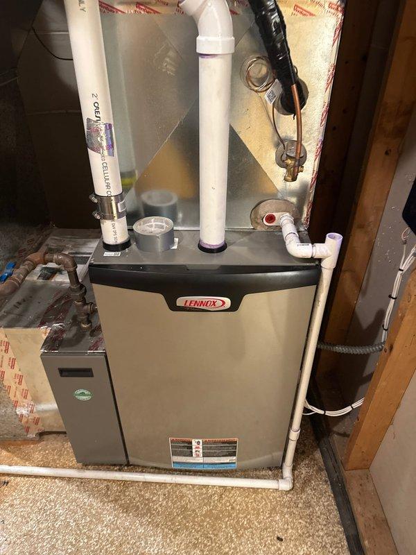 Arrived on site and successfully completed warranty service by removing and replacing defective heat exchanger in customer's Lennox furnace system. Performed full operational testing after installation to verify proper function of the unit. Documented installation with photos showing completed repair with all connections properly secured.