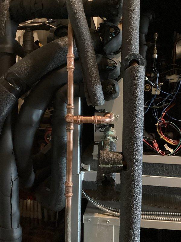 Responded to service call for geothermal heat exchanger leak. Identified faulty copper pipe connection, replaced affected section and properly rewired terminal connections per specifications. System tested and confirmed operational with no further leakage detected.