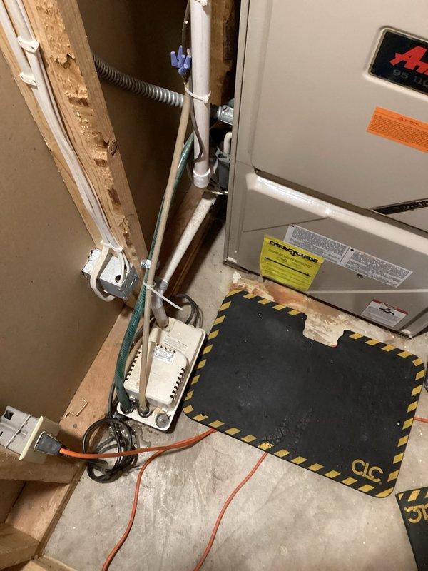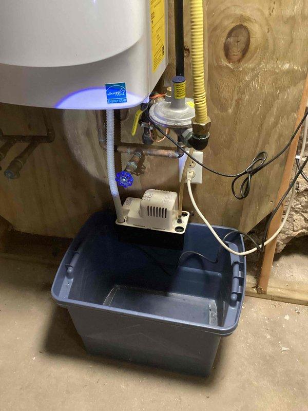 Upon arrival, diagnosed no heat condition caused by faulty aquastat control. Implemented bypass solution to restore heating function temporarily. Noted water heater installation with Energy Star rated tank mounted on plywood wall, connected condensate pump, and containment bin positioned below to capture any discharge.