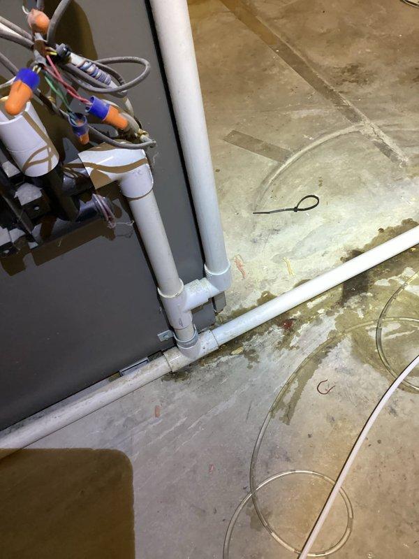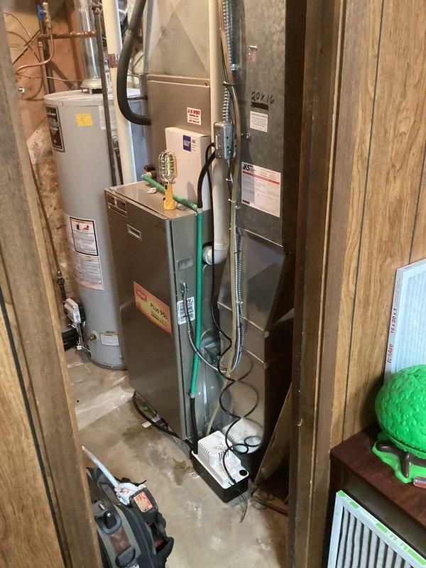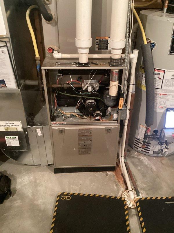 Responded to no heat call for residential furnace. Inspection revealed failed heat exchanger on existing unit. Documented condition with photos showing the furnace installation with proper PVC venting and condensate lines. Advised client on repair vs. replacement options based on age and condition of equipment.