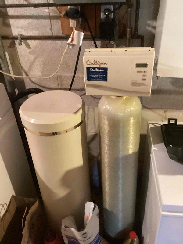 Arrived within scheduled window (12-4) to address a broken water treatment component. Diagnosed issue with softener system, removed the softener loop, properly reconnected the softener unit, and successfully returned system to service mode. Visual inspection confirms proper installation of dual-tank water treatment system (white cylindrical tank and translucent media tank) with functioning Culligan control unit.