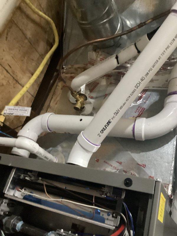 Performed scheduled preventative maintenance agreement service on HVAC system during 8-12 arrival window. Conducted comprehensive tune-up of equipment including inspection of PVC venting system, condensate drainage, and connection points. All components functioning properly with no issues identified.