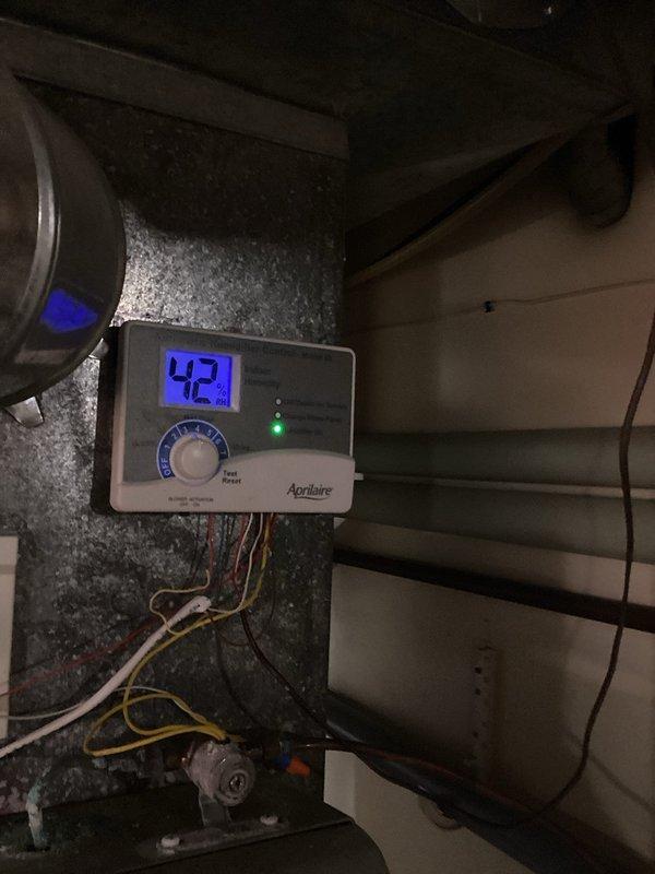 Responded to callback for Aprilaire humidifier with no power following recent software update to HVAC system. Diagnosed issue as loose wire nut connection. Repaired connection and verified proper operation of humidistat, now displaying 42% humidity with indicator light functioning.