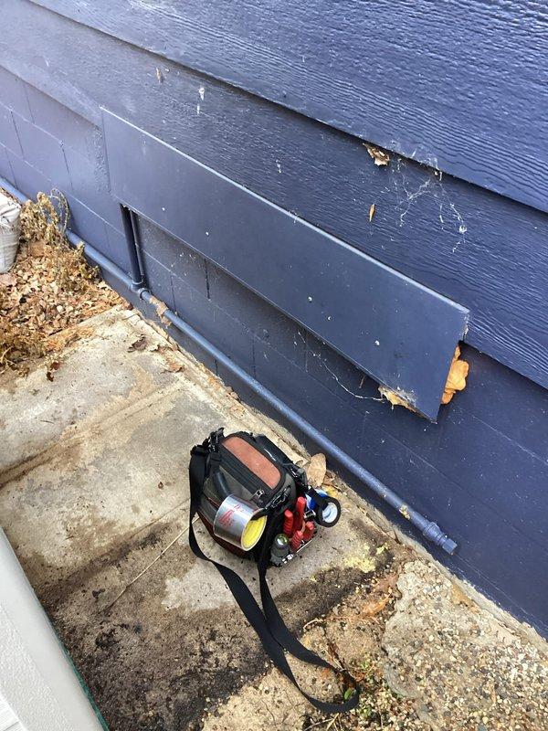 Performed inspection of ductwork and determined mice were entering through damaged exterior panel at foundation level. Located compromised external cap allowing pest ingress to the HVAC system. Recommended consultation with a siding company to properly seal entry points and prevent future rodent infiltration.