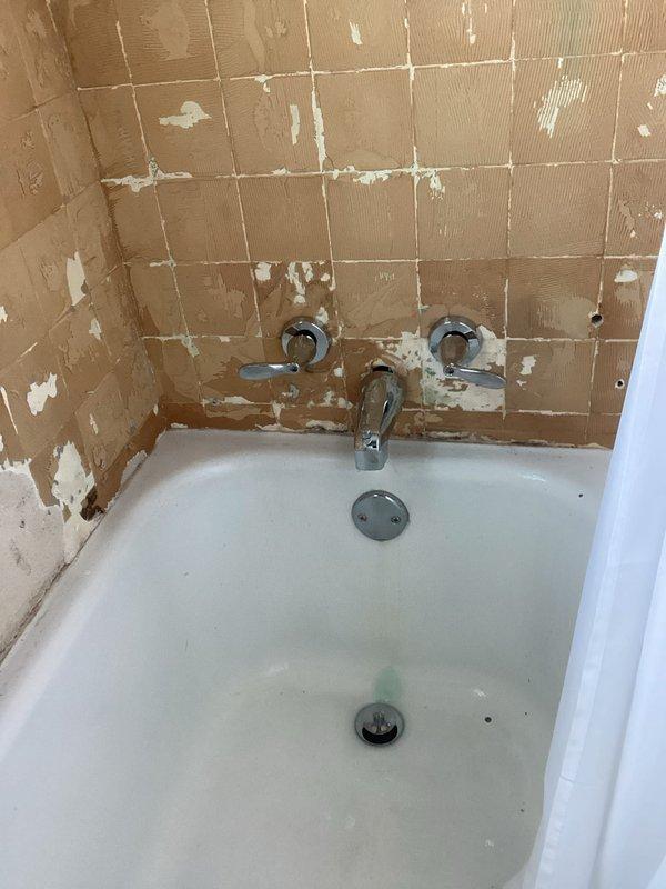 Responded to service call for two-handle bathtub faucet that would not shut off completely, causing continuous water leakage. Upon inspection, noted significant deterioration of surrounding wall tiles. Successfully replaced the faulty faucet assembly using customer-supplied parts, resolving the leak issue.