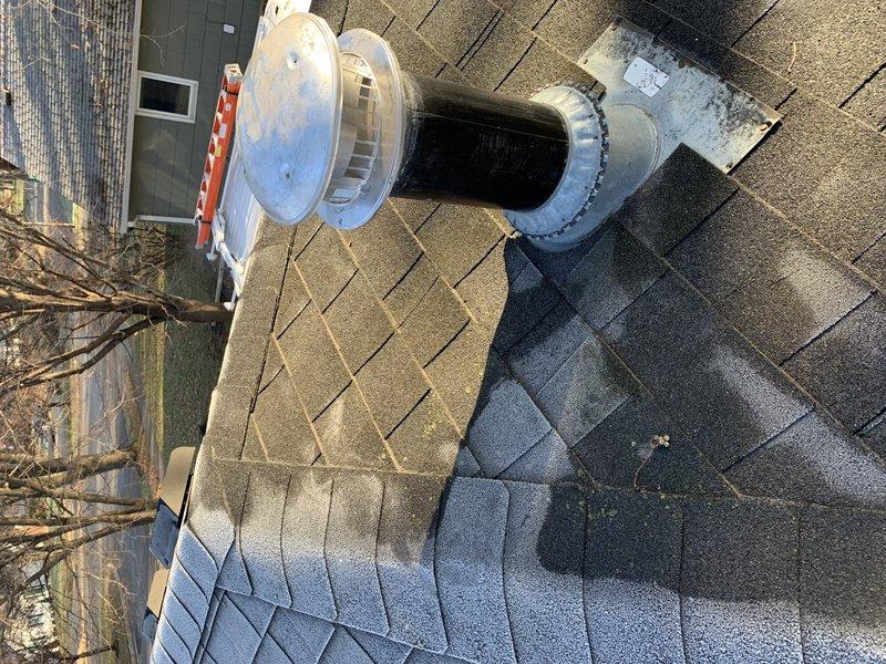 Responded to service call for roof vent cover issue causing water infiltration. Arrived on site, inspected the damaged metal chimney vent/exhaust pipe assembly, and replaced the roof vent to prevent further water intrusion.