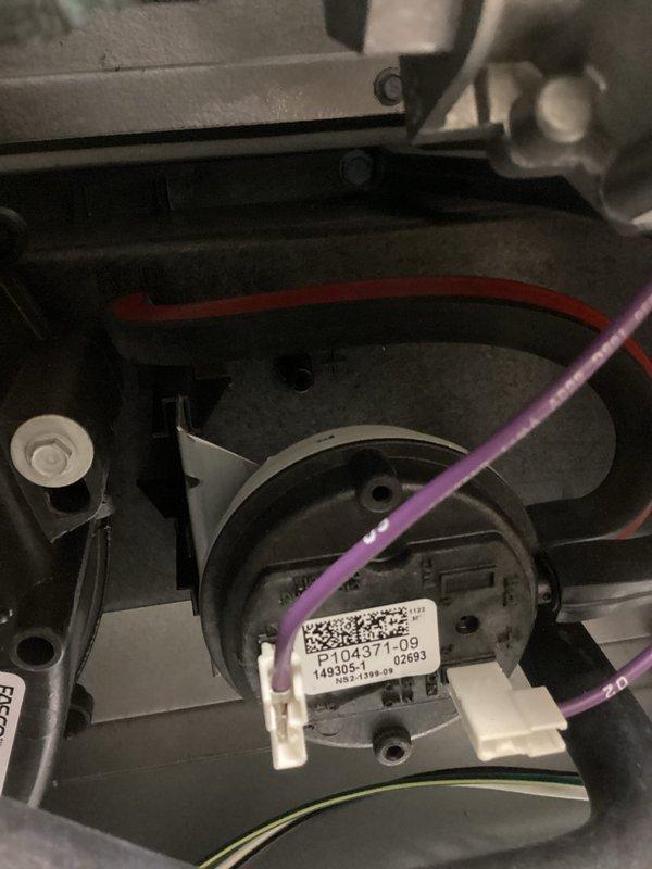 Responded to no heat call for aging unit with failed collector box. Performed temporary repair to restore heat functionality. Documented system components including pressure switch assembly (P104371-09) with attached purple wire connection. Permanent replacement recommended.