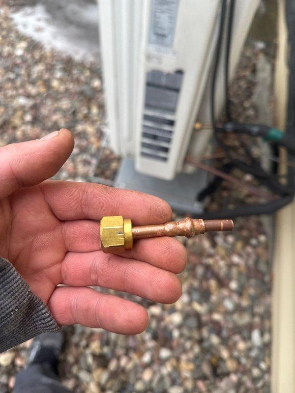 Diagnosed mini split system failure caused by refrigerant leak at deteriorated press fitting with rolled gasket. Removed defective component, replaced with new fitting, and restored proper refrigerant charge to manufacturer specifications to restore cooling function.