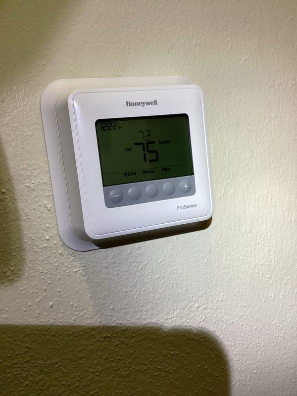 Responded to service call for furnace shutting off at night and thermostat not maintaining set temperature. Upon inspection, determined that programmed schedule on Honeywell ProSeries thermostat was causing unit to lower temperature during nighttime hours. Disabled programming feature and set thermostat to manual operation mode to maintain constant temperature setting of 75°F, resolving the issue.