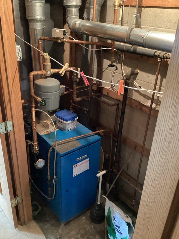 Responded to service call for hydronic boiler with pin hole leak in pipe. Diagnostic inspection revealed significant corrosion on copper piping and deteriorated components. Temporary repair completed; scheduled follow-up service for Friday to implement permanent solution.