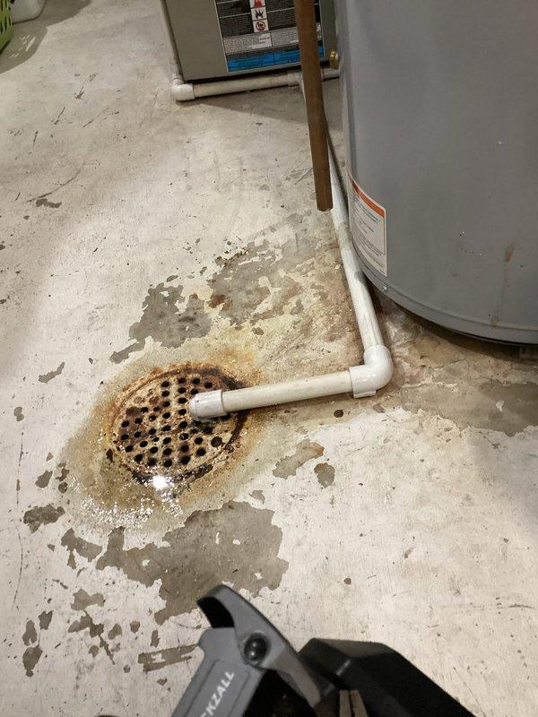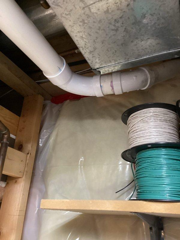 Responded to service call regarding leaking humidifier. Diagnosed issue with condensate drain line pulling on basement floor. Modified installation by cutting through drain cover and installing a 90-degree fitting to properly direct flow and resolve drainage problem.