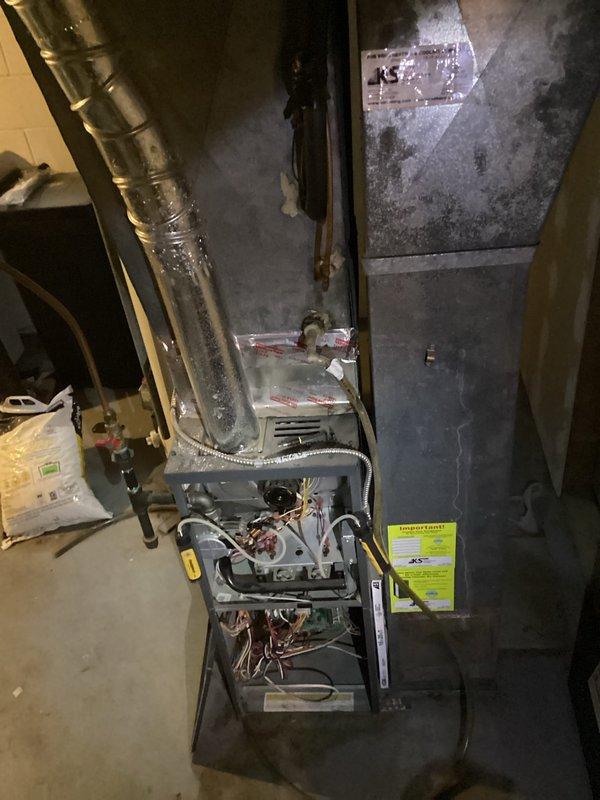 Responded to emergency no-heat call for aging heating system. Diagnostic testing revealed failed booster fan and a 13-inch crack in heat exchanger, documented with detailed inspection photos. Due to severity of damage and safety concerns, recommended full system replacement; project manager dispatched to provide customer with replacement options.