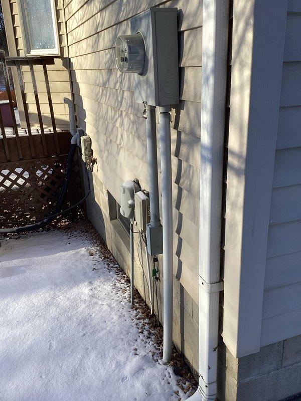 Responded to service call for CSST gas line bonding. Upon inspection, discovered conditions were not suitable for proper bonding installation due to cold weather. Documented existing electrical service components including meter and junction boxes. Service rescheduled for installation when weather conditions improve.