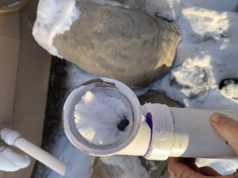 Responded to no-heat call for furnace under 10 years old. Diagnosed blocked intake pipe with significant frost buildup. Cleared obstruction from PVC intake pipe and repositioned decorative rock that was blocking proper airflow. System restored to normal operation.