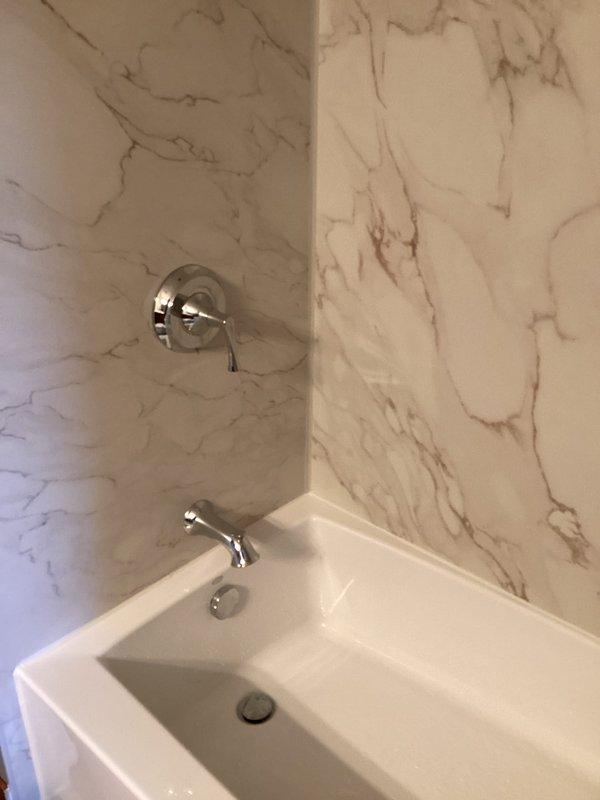 Responded to service call for a reported leak from recently installed bathtub. Conducted thorough inspection of the bathroom installation featuring white tub with marble-like wall panels and chrome fixtures. No active leaks detected in the plumbing system. Customer reassured that new tub installation is functioning properly with no issues identified.