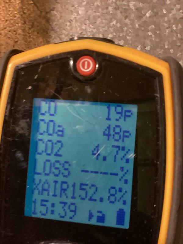 Completed scheduled preventative maintenance agreement on heating system. Performed comprehensive combustion analysis with readings within acceptable parameters (CO 19P, CO2 9.7%, excess air 152.8%). All system operations verified and tuned for optimal performance.