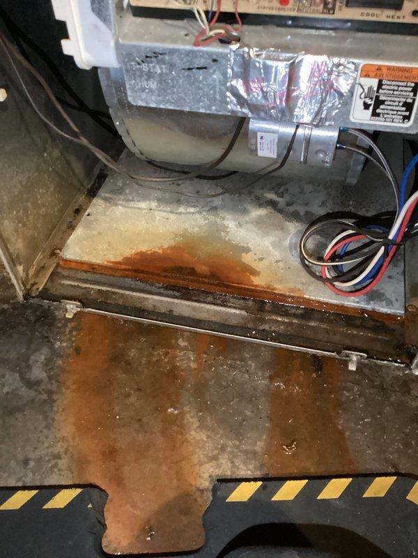 Responded to service call for water leakage from furnace. Upon inspection, identified disconnected condensate trap hose causing water to leak and create rust/corrosion on lower cabinet. Reconnected hose to restore proper condensate drainage and prevent further water damage.
