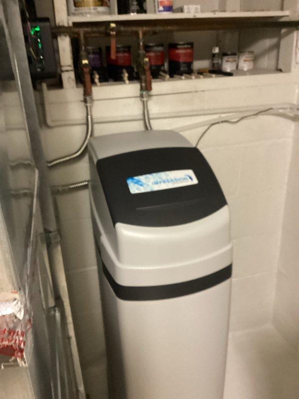 Successfully installed a new Impression water softener system in customer's utility area, including connection of all necessary copper pipes and flexible metal connectors. System was properly set up with control components functioning as expected, and customer was provided with treatment chemicals for ongoing maintenance.
