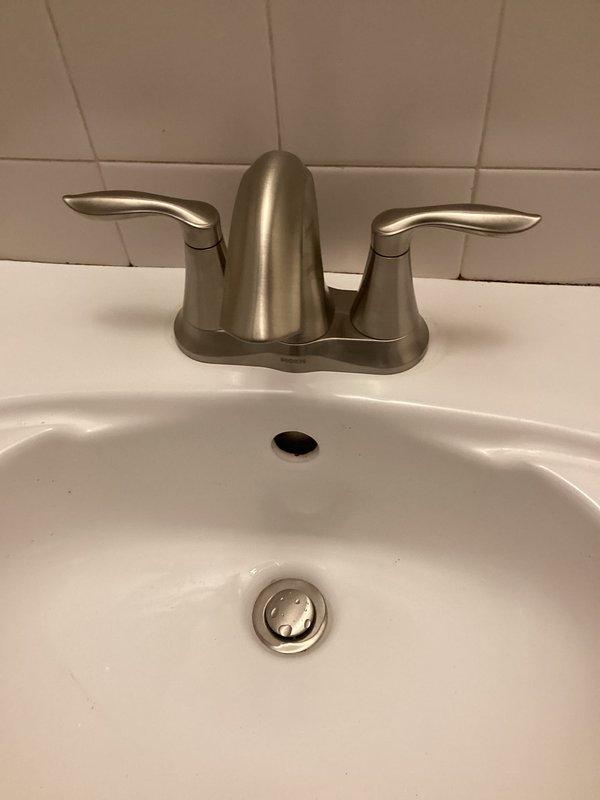 Successfully installed customer-provided Moen lavatory faucet in bathroom as per sold bid. Completed installation with new brushed nickel/stainless steel fixture featuring dual lever handles, replacing previous unit. Job completed with proper functional testing.