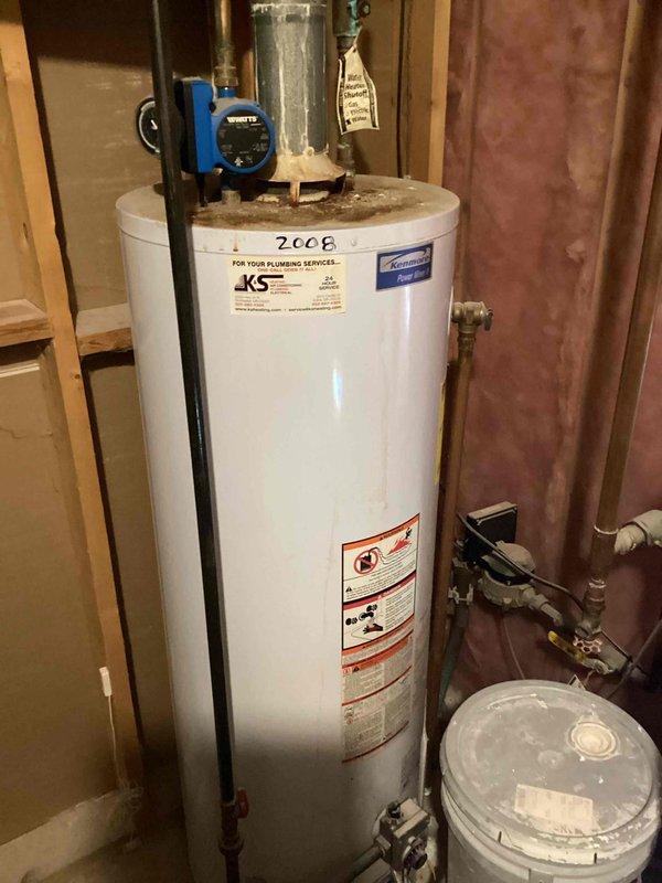 Responded to water heater leak complaint and performed diagnostic inspection. Upon arrival, identified active leak originating from the tank body of a 2008 water heater unit. Confirmed tank failure with water seepage through the vessel itself, indicating internal corrosion and compromised structural integrity. Documented equipment condition with photographs showing the existing installation, including circulation pump, plumbing connections, and expansion tank configuration. Provided estimate for complete water heater replacement as repair is not feasible due to tank failure.