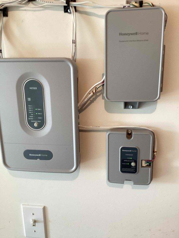 Responded to boiler callback for unit not operating correctly. Inspected and serviced Honeywell Home control system including thermostat (model H2332), Equipment Interface Module (EIM), and associated control components with proper wiring connections verified.