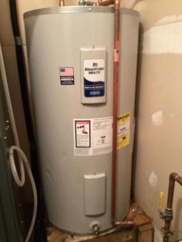 Successfully installed a 50-gallon Bradford White electric short water heater with proper copper piping connections. Restored hot water service after customer had been without since September.