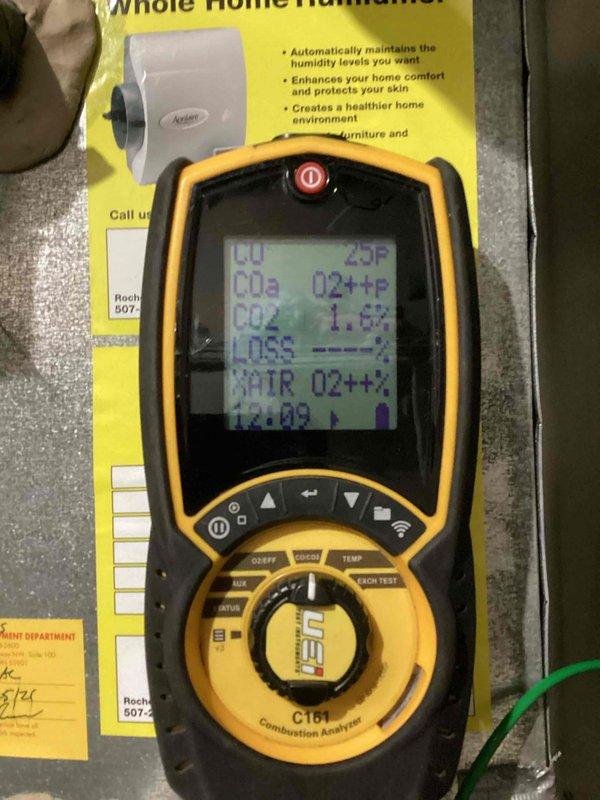 Completed rescheduled furnace preventative maintenance agreement. Performed combustion analysis using UEi C161 Combustion Analyzer to verify proper system operation. Shared information about whole home humidifier options for improved indoor air quality and comfort.