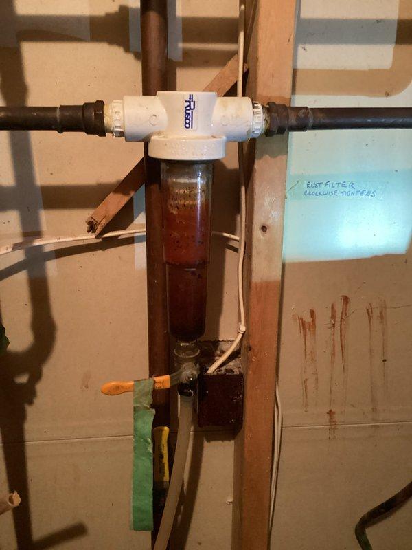 Responded to service call for whole house water treatment system. Arrived on-site and replaced the sediment/rust filter in the customer's wall-mounted filtration system. Removed accumulated rust particles and properly installed new filter element, restoring proper water filtration functionality.