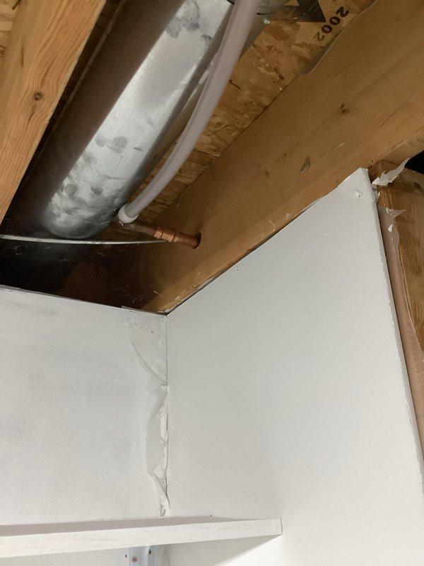 Responded to service call for leaking outdoor hose bib causing interior water damage. Inspection revealed burst hose bib as root cause. Replaced damaged fixture with frost-free hose bib to prevent future freezing issues. Access area included copper supply line running along joists where leak occurred.