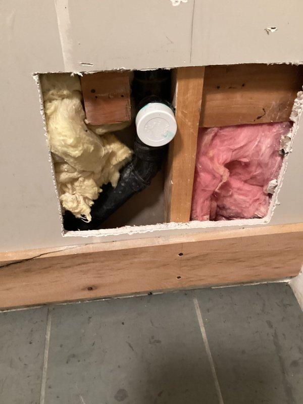 Arrived on site to address leaking dishwasher supply lines and drain. Successfully capped both hot and cold water supply lines and capped the drain line to prevent further leakage. Accessed plumbing components through wall cavity, working around existing insulation and structural elements.