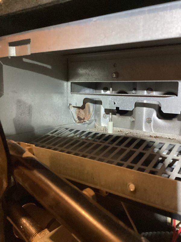Responded to no heat service call for furnace 10+ years of age. Upon inspection, diagnosed failed heat exchanger with visual evidence of corrosion and rust on interior metal framework. Connected customer with project manager for replacement options.