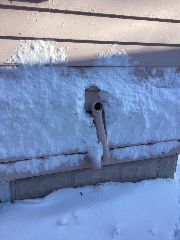 Responded to no-heat call for 25-year-old furnace. Diagnosed exhaust vent pipe obstruction due to heavy snow accumulation against exterior wall. Cleared snow around PVC vent pipe to restore proper ventilation, cleaned system, and restored normal heating operation.