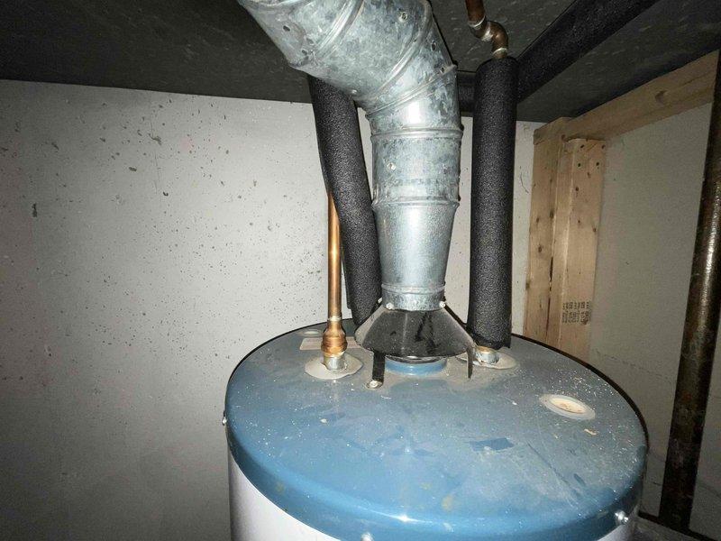 Performed on-site inspection of water heater installation in basement utility room. Observed standard tank water heater with galvanized metal vent pipe, dual black insulated pipes, and copper supply connection showing signs of age including surface discoloration and water marks on tank cap. No duct cleaning was performed as assessment revealed system was functioning properly despite moderate dust accumulation.