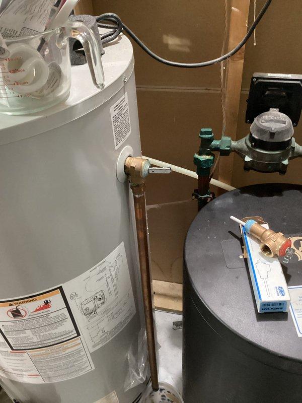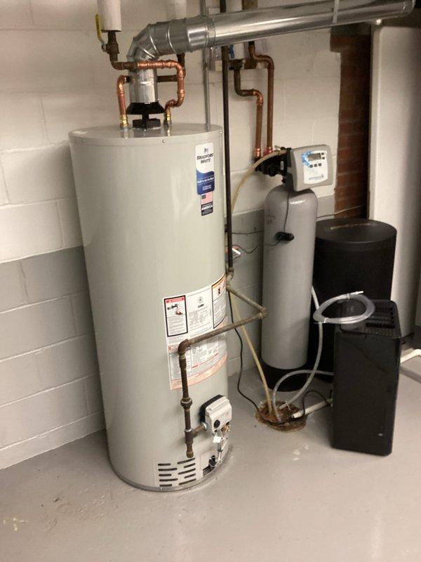 Successfully installed a new 50-gallon standard vent water heater according to the sold bid specifications. Completed all necessary connections to existing copper plumbing and properly vented the unit through the metal ductwork. Final installation includes appropriate valves and connectors, with the unit positioned adjacent to the existing water treatment system.